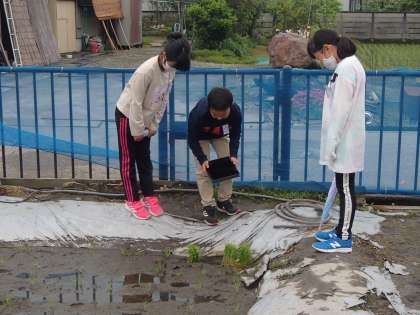 昨日、田植えを無事に終えた子供たちは、今日から田んぼや稲の成長の様子を毎日観察していきます。子供たちは話合いの結果、グループを決めて、当番制で行うことにしました。記録にはクロムブックを活用しています。