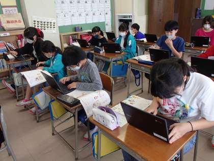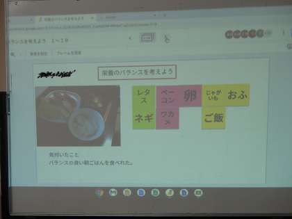家庭科「朝食から健康な1日を」では、朝ご飯の役割を考え、その後、自分の朝ご飯をジャムボードを使って、赤、黄、緑の食品にグループ分けしました。ジャムボードは、付箋の機能があるのでパッとバランスに気付くことができるのです。だから、子供たちは、「思ったよりバランスがいいんだ」「どの食品も結構とれてる」「僕は、赤ばかりだったから、緑もとらなくちゃ」などと振り返っていました。