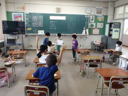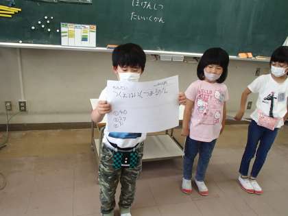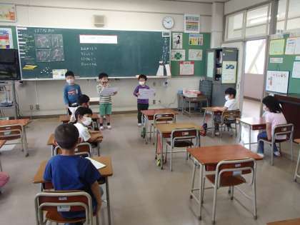 今日の生活科は、「がっこうたんけん」で子供たちがグループで見付けてきたひみつの発表会をしました。今日は、音楽室チームと体育館チームが発表しました。「いちばん高いとびばこは、何段でしょう」「カスタネットはどこにあるでしょう」など、なかなか難易度が高いものもあり、みんな悩んでいました。今日は、2つのチームが発表しましたが、子供たちは、まだまだ知らないことが多くあることに気が付きました。このあとも、自分たちで課題を見付けて学習していく予定です。