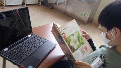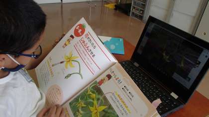 育てている野菜を観察すると、黄色い花や白い丸い物が出来ていました。教室に戻り、畑で撮った自分の野菜の写真と本を見比べながら、調べてみました。