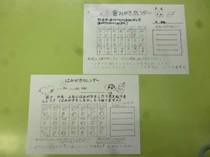 「歯と口の健康月間」の取組として、今日は、すこやか委員会の子供たちが手作りした「歯みがきカレンダー」を配布しました。1日3回歯をみがいて、元気な寒江っ子でいてほしいという願いを込めて、上学年用と下学年用に分けて作りました。下の写真は、お昼に放送で呼びかけをする、すこやか委員の様子です。
