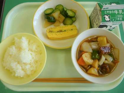 今日の給食は、ごはん、牛乳、酢豚、エゴマ入り卵焼き、かふう和えです。