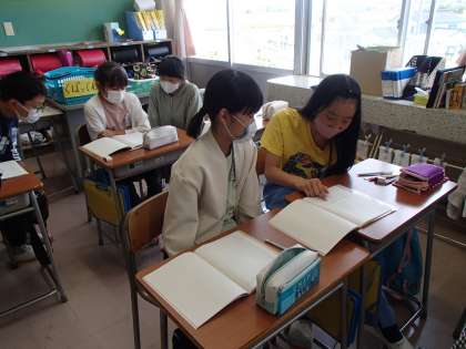 算数科「分数のかけ算を考えよう」では、計算の仕方を説明する学習を行いました。今までは、真分数×真分数や真分数×整数だったのですが、今日は、帯分数×真分数の計算をしました。子供たちからは、帯分数を仮分数になおして計算する方法と、分数の足し算の時のように帯分数のまま計算する2通りの考えが出てきました。そうすると、2つの答えが違うことにびっくり!!「なんで?」「どっちが正しいの?」と話し合いが始まりました。でも、なかなか解決できませんでした。私が「これは、かけ算だよね?かけ算は、数字を分解して解いていいんだっけ?」と言った瞬間、「あ、そうやった。数字を分解してはいけないんだ」「仮分数にしないとだめなんだ」という結論に達しました。最後の練習問題は全員解くことができ、すっきり終わることができました。