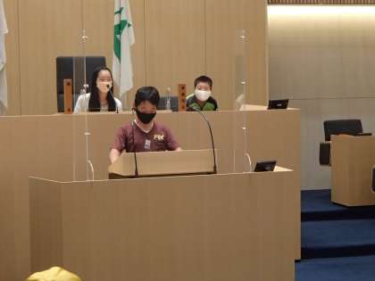 午後からは、県庁と富山県議会場を見学しました。県庁では、どんな仕事をしているのかを教えていただいたり、議会場では、実際に議会が行われている場所を見たりしました。議会場では、子供たちで知事、議長、事務次官の役割を分担し、議会を再現しました。授業では映像で見ることしかできなかったので、実際に体験することができ、理解が深まったのではないかと思います。「家に帰ったら、おじいちゃんに知事席に座ったことを伝えよう」とうれしそうな子供たちでした。