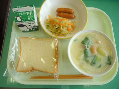 今日の給食は、食パン、豆乳シチュー、ウインナー、おろしポン酢サラダです。