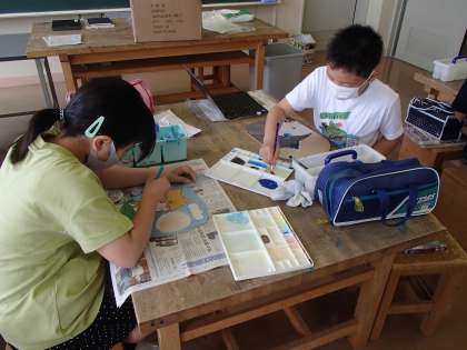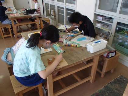 図画工作科では、電動糸のこぎりを使用して板を切りぬき、様々な形のホワイトボードづくりに取り組んでいます。安全に気を付けて、糸のこぎりを使用することができました。色塗りも終盤になっています。