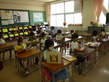図書室に新しい本が入り、今日から借りることができます。毎日の読書タイムに読む本を借りに来ている子供もいました。図書室では、火曜日と木曜日に学校司書が勤務しています。おすすめの本を紹介したり、調べ学習の手助けをしたりしています。年間目標冊数を目指して、読書貯金を増やしていきましょう。