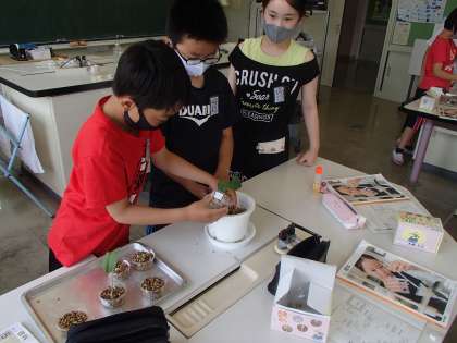 今日の4限の理科では、「植物が発芽した後、さらに成長に必要な物は」何かについて考え、条件を整理して調べることができるように準備していました。これまで理科室で育てていたインゲンマメたちを、鉢に移したり、花壇に植え替えたりしました。どのようになるか、楽しみです。