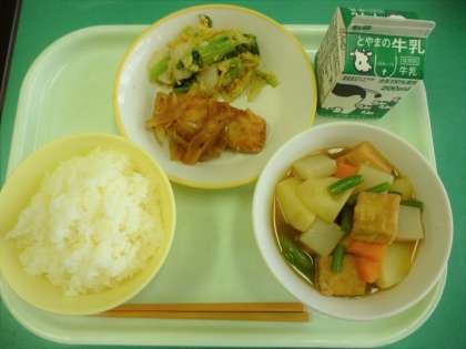 今日の給食は、ごはん、牛乳、魚の南蛮漬け、いり大豆和え、関東だきです。