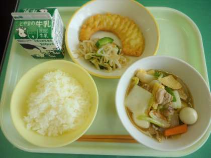 今日の給食は、ごはん、牛乳、八宝菜、かぼちゃの天ぷら、甘酢和えです。