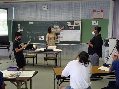 外国語活動「Where do you want to go〜?」では、自分の行きたい国を紹介し、なぜ行きたいのかを友達に伝える学習を行いました。子供たちは、決まった型の文章をリズムに合わせて発音したり、チャンツを歌ったりして英語に親しんでいました。また、ALTが発音する英語を聞き取りながらかるたをしたり、ペアで会話の練習をしたりするなど、子供たちは英語に慣れ親しんでいました。耳で英語を聴き、話すことを楽しんでいます。