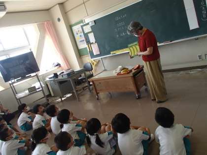 朝の時間は、地域の方に来ていただいて、読み聞かせをしていただきました。バナナのお話でした。終わりには、本物のバナナに爪楊枝でかいた文字を見せてくださいました。