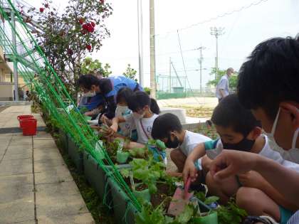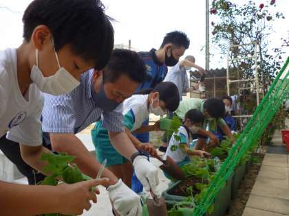 総合で地球温暖化について学習している子供たちは、地球温暖化を防ぐために自分たちにできる取組として、グリーンカーテンをつくることにしました。いろいろな方の協力を得て実現した植樹式、立派なカーテンになるように、一生懸命世話をしたいと意気込んでいました。