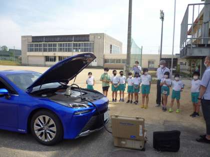 植樹式の後には、水素だけで走るエコでかっこいい車を目の前で見て、興奮気味のようすでした。