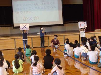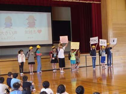 計画委員会主催の「あいさつの輪を広げよう集会」を行いました。今年は、「大きな声じゃなくてもいいので、心をこめて自分のできるあいさつをしよう」という目標を計画委員会で話し合い、それが伝わるように子供たちが劇の台本を作り、全校に伝えました。また、あいつさのゲームをしたり、あいさつの歌を全校で歌ったりしました。計画委員会の子供たちは、自分たちで計画し、自分たちで考えて集会をつくり上げました。きっと、「あいさつって大切だな」というメッセージが伝わったのではないでしょうか。