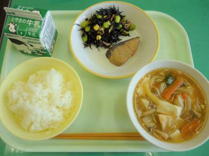 今日の給食は、ごはん、牛乳、ふくらぎの西京焼き、ひじきのソテー、豆腐の野菜あんかけです。