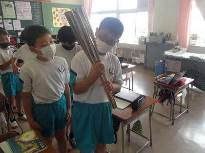 1限の始めには、地域の方からお借りした東京オリンピックに向けた聖火リレーで使用されたトーチを見たり、手に持ったりしました。一生に一度あるかないか、貴重な体験ができました。