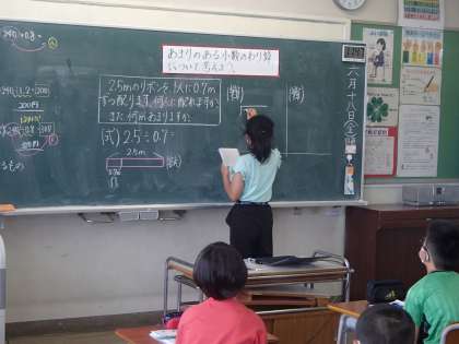 4限の算数では、あまりのある小数のわり算について、みんなで考えました。