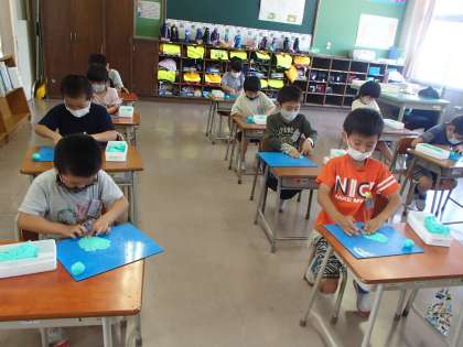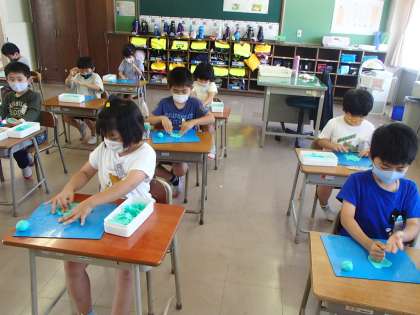 今日の図工は、ねん土の技法を学習しました。「まるめる」「うすく」「ひも」「ねじる」「つまみ」「にぎる」など、ねん土を使って、手指の体操をしました。「ねじる」でソフトクリームができたり、「ひも」をまくとクッキーになったり、「つまみ」でギョウザができたりしました。みんな次回の「ごちそうパーティ」を楽しみにしています。
