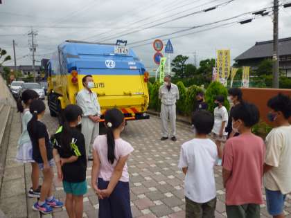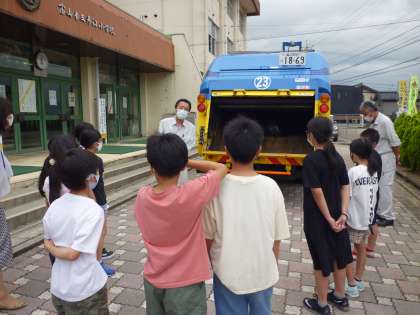また、授業の最後には、ごみ収集車を間近で見ながらごみ収集車の秘密についても学ぶことができました。