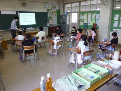 今日は、3R推進スクールがありました。これまでに社会科や総合的な学習の時間でごみ調査隊の活動をしたり、地球温暖化について学習している子供たちは、とても興味津々に話を聞いていました。