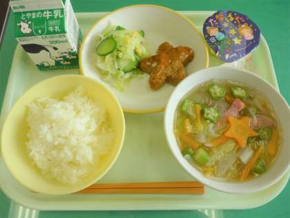 今日の給食は、ごはん、牛乳、星形ハンバーグ、コーンサラダ、天の川スープ、七夕デザートです。今日は、七夕メニューでした。