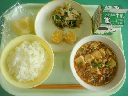今日の給食は、ごはん、牛乳、マーボー豆腐、にんじんシューマイ、ナムル、冷凍りんごです。