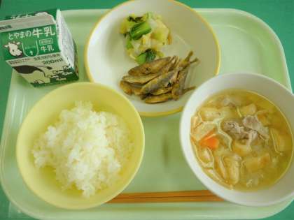 今日の給食は、、ごはん、牛乳、小あじのから揚げ、チンゲンサイひたし、豚汁です。