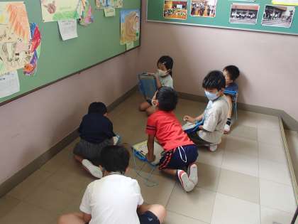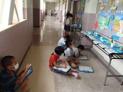 水曜日の図工は、作品鑑賞会をしました。まず、美術館での鑑賞のマナーをみんなで確認しました。「しずかに」「はしらない」「さわらない」を守って、みんな目と心で、友達の作品のすてきなところをたくさん見つけていました。