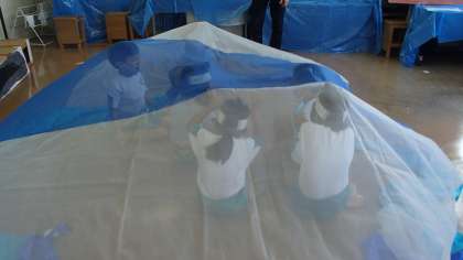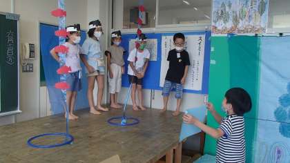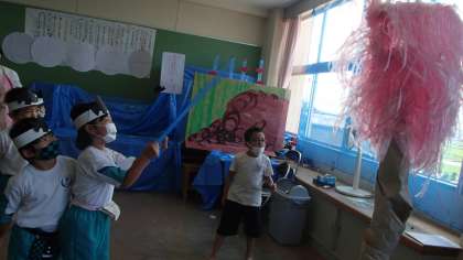 スイミーのお話の内容にあったスイミーランドを考えてつくり、今週は2年生と赤団の1年生さんをスイミーランドに招待しました。