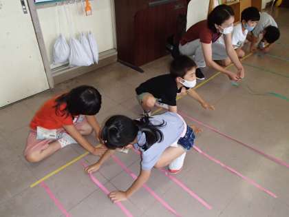 算数では、「どちらが ながい」を学習しています。昨日の算数は、教室の中のいろいろな長さを紙テープを使って測り、みんなで比べました。