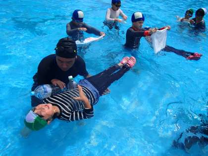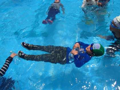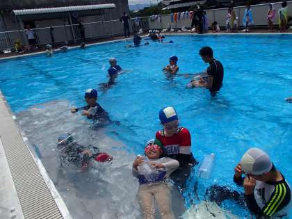今日は全校で、水難訓練の一つとして、着衣泳をしました。洋服のまま水に入ると、体が重くなってしまうことや、脱力して上向きに浮くことを体験しました。縦割り班のお兄さんお姉さんに見本を見せてもらったり、体を浮かせる手伝いをしてもらったりしました。服を着たまま水に落ちたとき、あわててバタバタしないこと、全身の力を抜いて浮くことを学びました。