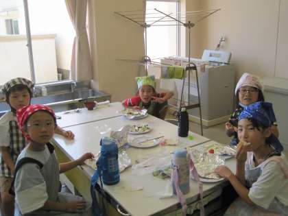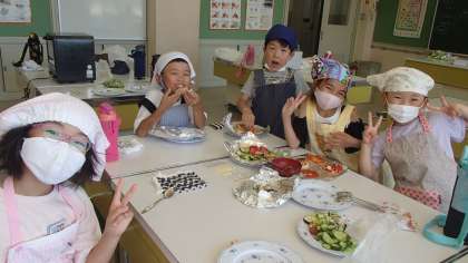 生活科の学習の一環として畑で野菜を育てています。子どもたちは、毎朝、欠かさずに水やりをし、観察をしながらその生長を見守ってきました。最近、どの野菜も収穫ができるまでに育ってきたため、学習の締めくくりとして、「野菜パーティー」を開くことにしました。全員がしっかり手洗いした後、餃子の皮に自分たちで育てた野菜やチーズなどの具をのせて、オーブントースターで焼いて食べました。「野菜、おいしい!」「パリパリして、おいしい!」と子どもたちは大喜び。みんなで収穫の喜びを分かち合いました。