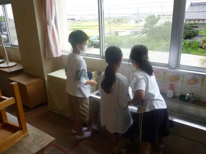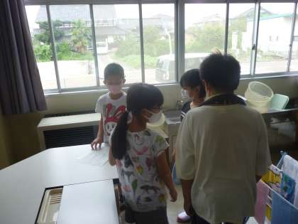 今日は、寒江小学校全体でエコな活動に取り組めるように、節電・節水シールを貼る場所を探しに行きました。