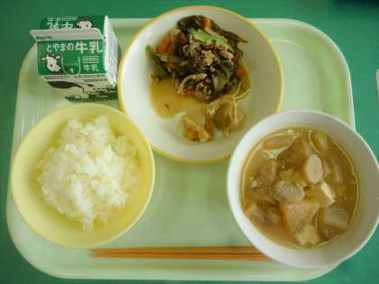 今日の給食は、ごはん、牛乳、ほたての香味焼き、もずくのチャプチェ、ごまけんちんです。