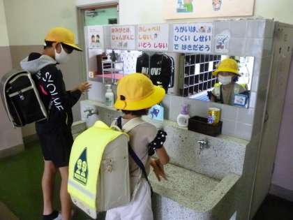 写真は登校後の手洗いの様子です。2学期が始まり一週間が経ちましたが、子供たちは丁寧な手洗いが必要なタイミングを意識し、忘れずに続けています。感染症対策へのご理解や、ご家庭での声かけ、準備等、本当にありがとうございます。