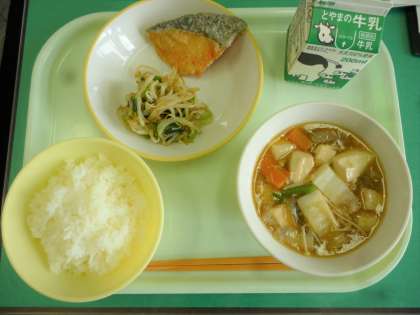 今日の給食は、ごはん、牛乳、鮭のから揚げ、小松菜ともやしの香味和え、豆腐の野菜あんかけです。