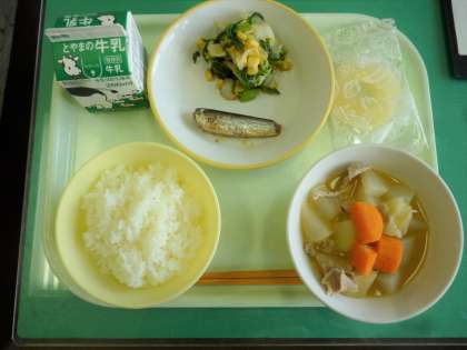今日の給食は、ごはん、牛乳、いわしの生姜味、コーン和え、大根のみそ煮込み、冷凍パインです。