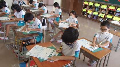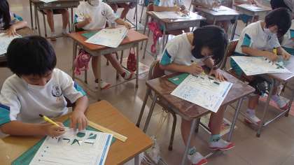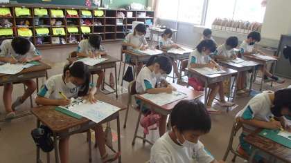 授業の最後に、窓のある「マンション」」「水族館」などのつくり方を説明しました。次回の図工で、子供たちが考える「つくってみたい窓のある建物」の作品をつくり始めます。