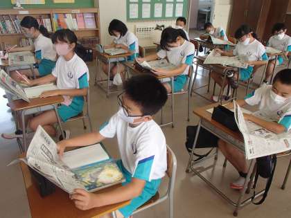 国語科「新聞を読もう」の学習をしました。新聞の一面にはどのようなことが書かれているのか、じっくり見てみました。新聞には、新聞名や発行日、目次や天気予報等、様々な情報が載っていることに気が付きました。次回は、全国版と地方版とで、記事の書きぶりがどう違うのかについて学びますが、この学習を機会に、新聞が少しでも身近なものになってほしいと思います。