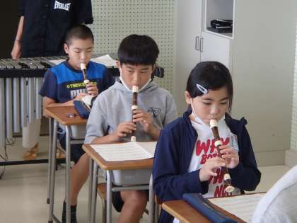 音楽科では「虹」の合奏に取り組んでいます。子供たちは「虹」がすごく気に入っており、朝や休み時間など、自分たちで声を掛け合って合わせており、きれいな音色が三階に響き渡っています。自主的に練習している子供が多いので、合わせてもとても美しいのです。子供たちも合奏しながら「きれいで涙が出そう」と言っています。最後まで仕上がるのが楽しみです。