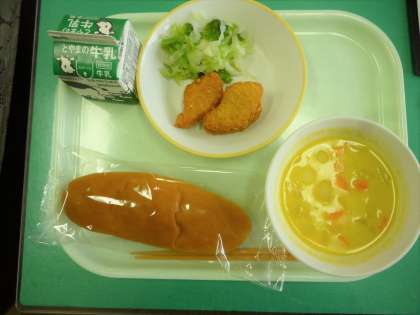 今日の給食は、コッペパン、牛乳、チキンナゲット、フレンチサラダ、かぼちゃポタージュです。
