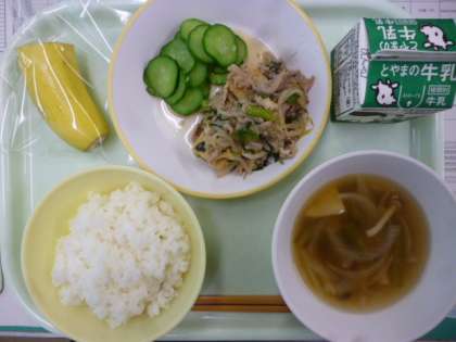 今日の給食は、ごはん、牛乳、豚肉のキムチ炒め、きゅうりもみ、茎わかめスープ、バナナです。