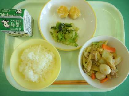 今日の給食は、ごはん、牛乳、八宝菜、にんじんシューマイ、小松菜ひたしです。