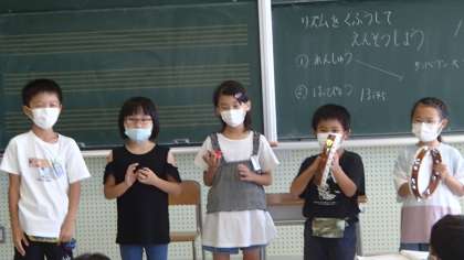 音楽では、2拍子のリズムを工夫して考えて、練習をしていました。今日は、他のグループの前で発表しました。