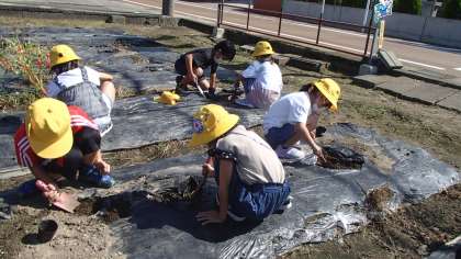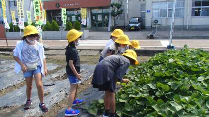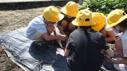 それから、育てているサツマイモを見ていると、「おんぶバッタだ」「コオロギ見つけた」と虫取りを始めるなど、いろいろな事に興味いっぱいの子供たちです。