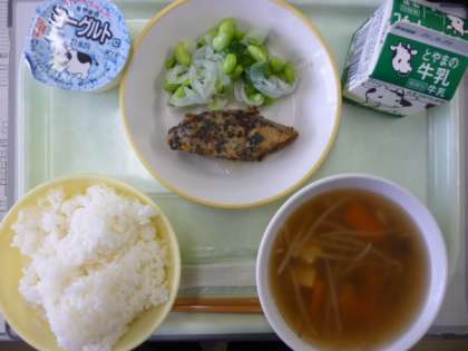 今日の給食は、ごはん、牛乳、ふくらぎのえごま揚げ、枝豆のマリネ、豆腐スープ、ヨーグルトです。