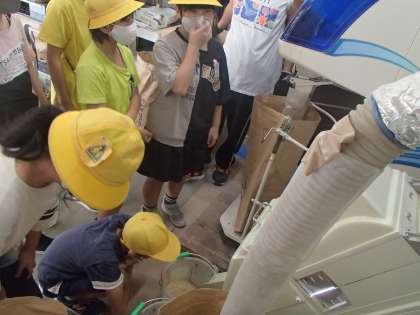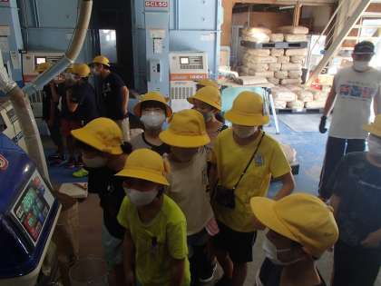 今日の2限は、地域の方の協力の下、機械によるもみすりや玄米の袋詰めの様子を見学させていただきました。子供たちが想像していた以上に、いくつもの機械を使用して行われていたことに驚いたり、手作業でするとなると、どれほどの時間がかかるのだろうとこれからの自分たちの学習のことについて、想像をふくらませたりしていました