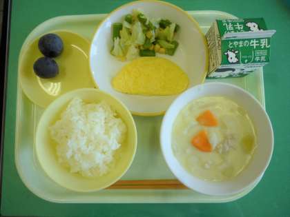 今日の給食は、ごはん、牛乳、オムレツ、アスパラサラダ、白いんげん豆のシチュー、巨峰です。
