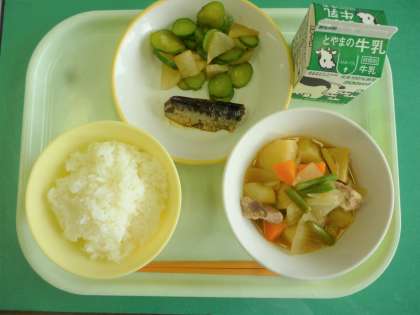 今日の給食は、ごはん、牛乳、いわしの土佐煮、華風和え、豚肉とじゃがいものうま煮です。